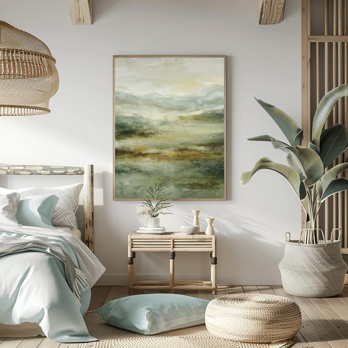 It's absolutely perfect for a bedroom or any space where you want to feel relaxed and calm. The soft, mixed colors go well with light, natural decor (like the setting in the picture) and add a wonderful touch of color without being too distracting. It’s a very soothing and elegant piece.
