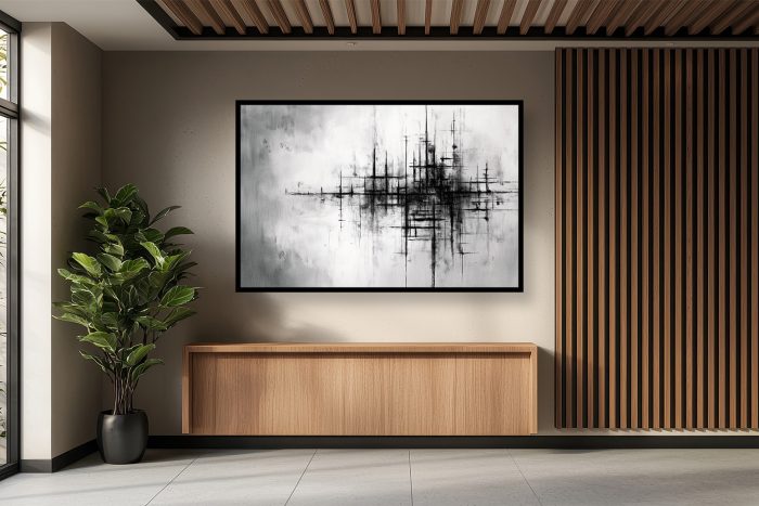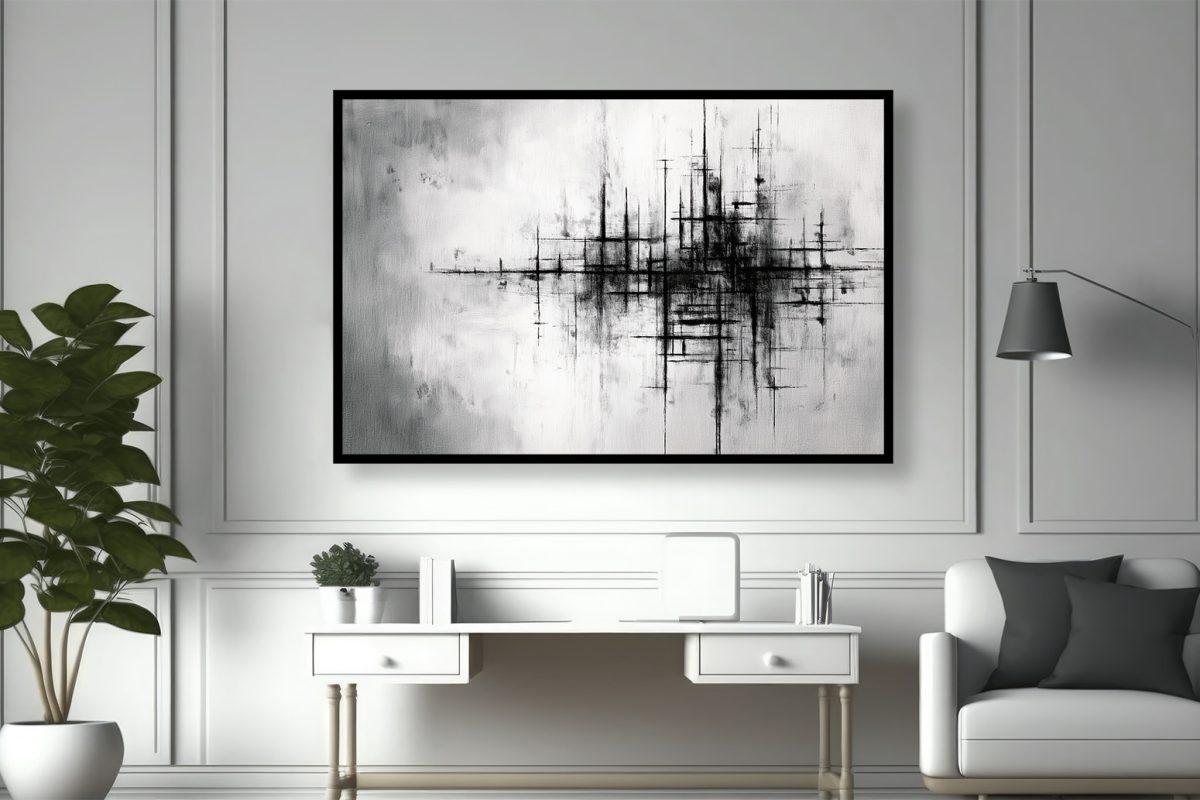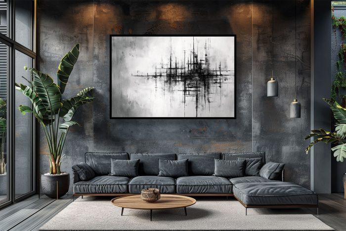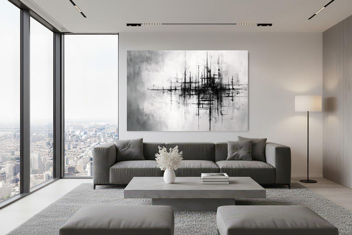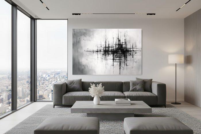 Experience Metropolitan Echoes, an Abstract Canvas Wall Art that captures the intricate pulse of urban architecture and abstract cityscapes through striking monochromatic contrasts and dynamic lines, ideal for a sophisticated modern interior.