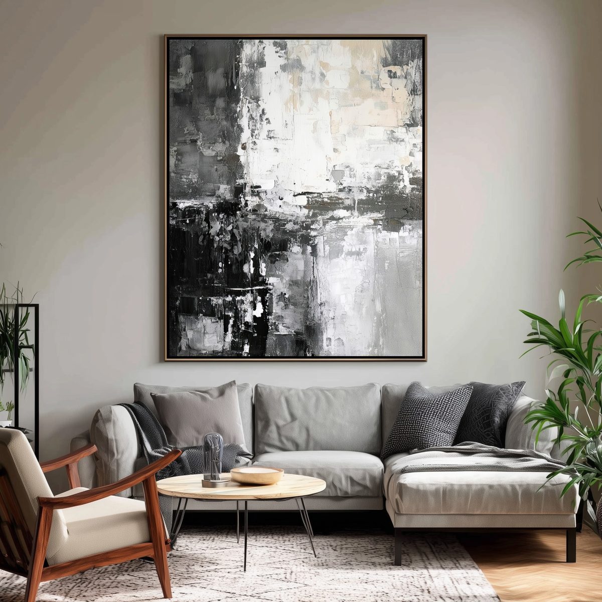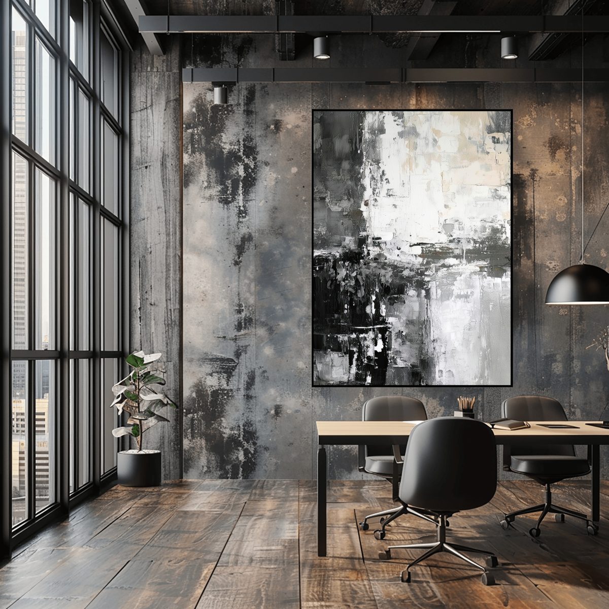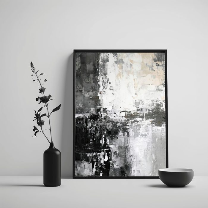 Monochrome Metropolis is a compelling Abstract Canvas Wall Art that plunges into the heart of modern urbanity, rendered with striking flair in timeless black, white, and every shade of grey in between. This artwork is a powerful symphony of bold, impasto brushstrokes and rugged textures, evoking the raw concrete facades, reflective glass, and shadowed alleys of a bustling city. The composition feels like a fragmented yet cohesive view of an evolving cityscape, offering endless visual intrigue as light and shadow play across its rich surface. It’s a statement of sophisticated power and minimalist drama.