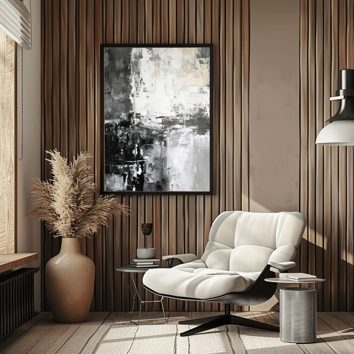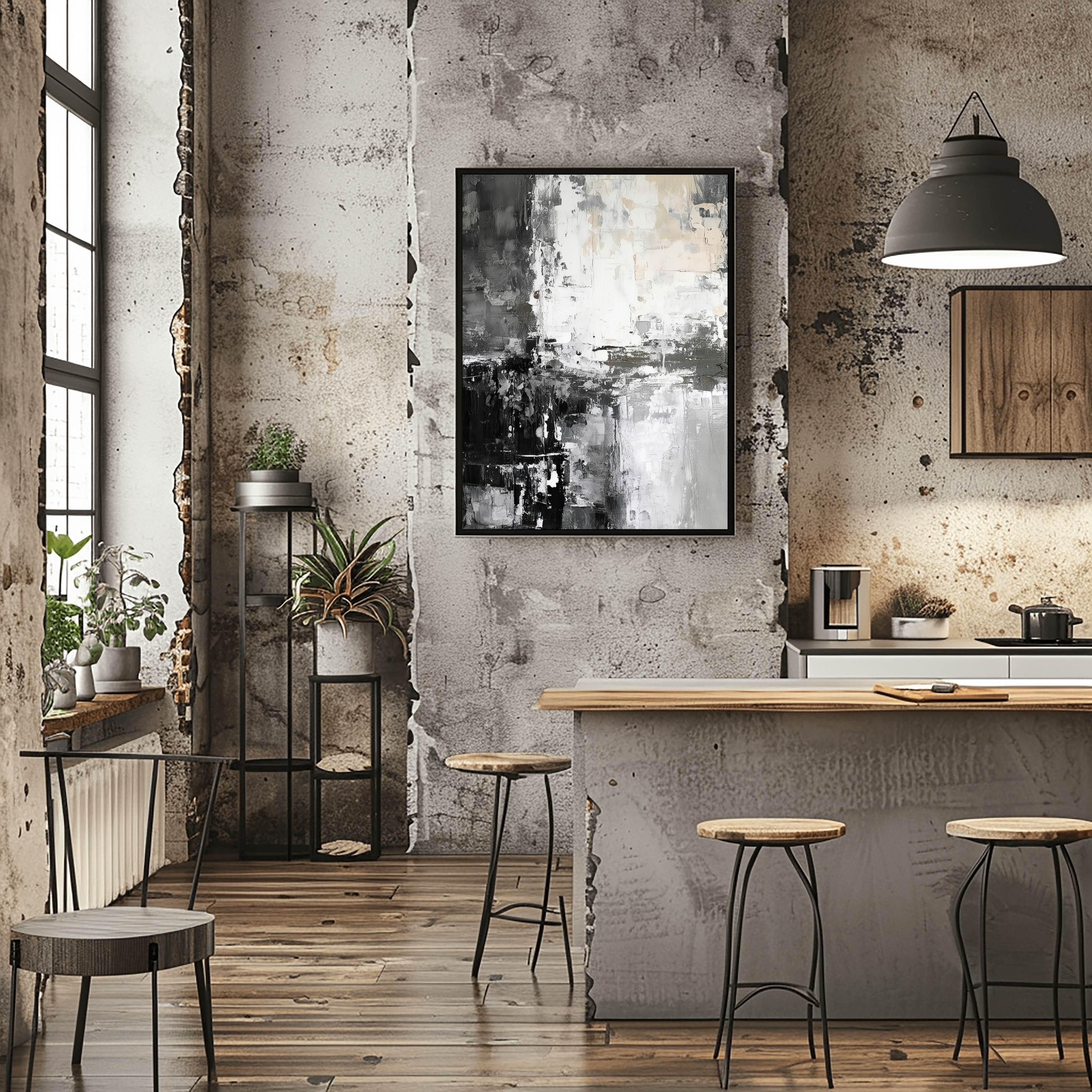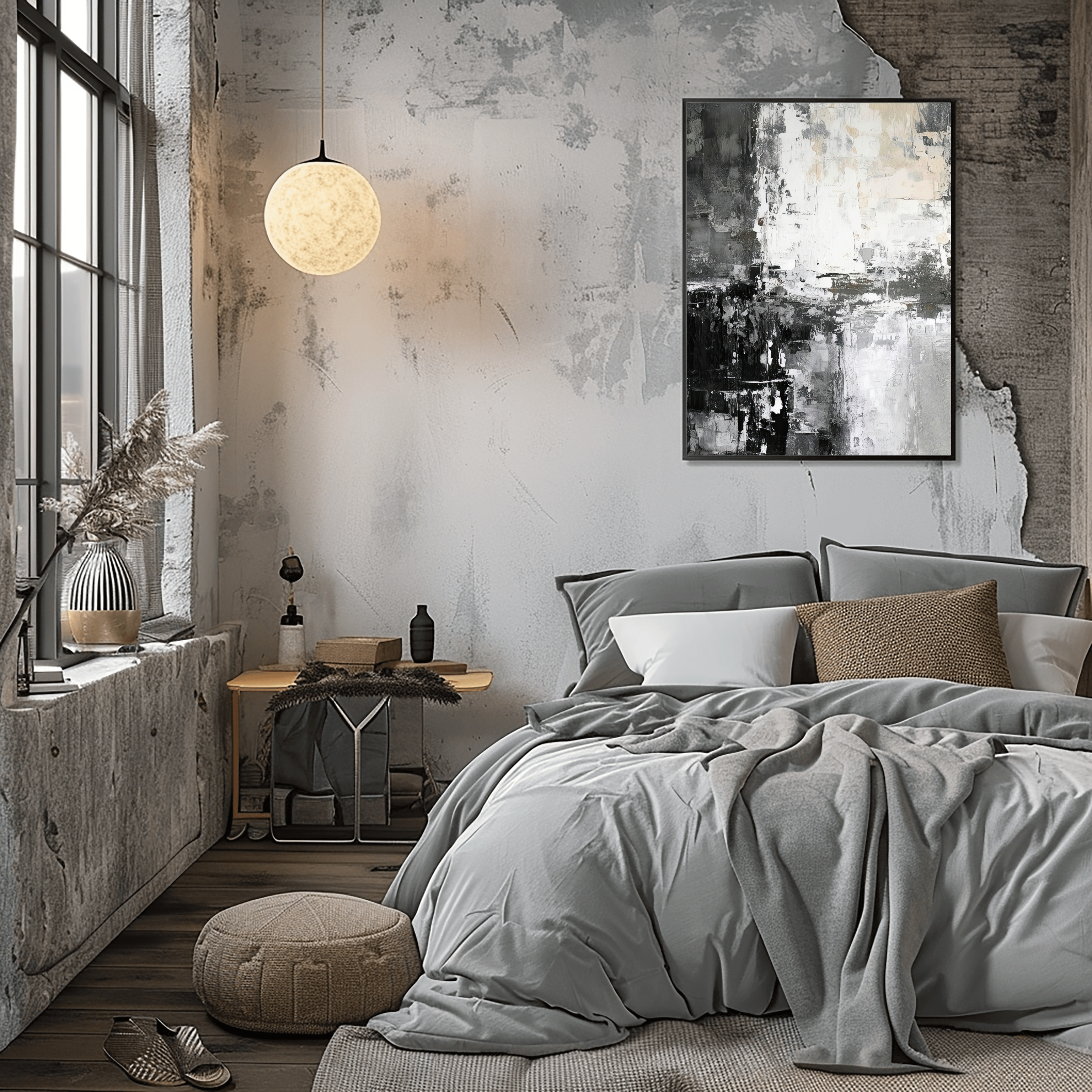 Monochrome Metropolis is a compelling Abstract Canvas Wall Art that plunges into the heart of modern urbanity, rendered with striking flair in timeless black, white, and every shade of grey in between. This artwork is a powerful symphony of bold, impasto brushstrokes and rugged textures, evoking the raw concrete facades, reflective glass, and shadowed alleys of a bustling city. The composition feels like a fragmented yet cohesive view of an evolving cityscape, offering endless visual intrigue as light and shadow play across its rich surface. It’s a statement of sophisticated power and minimalist drama.