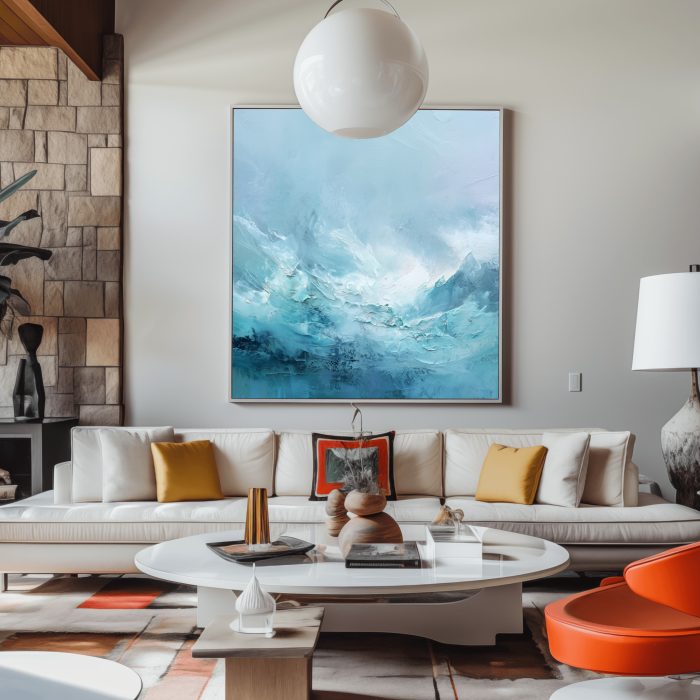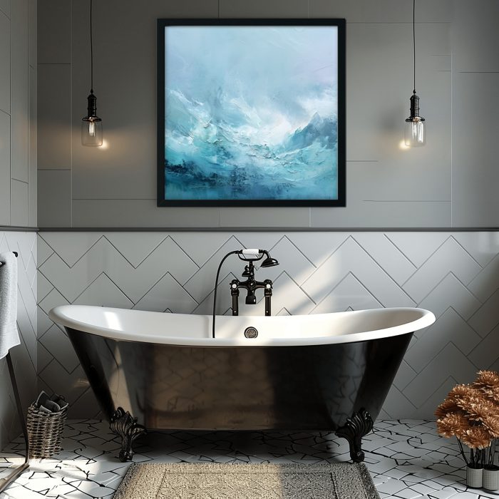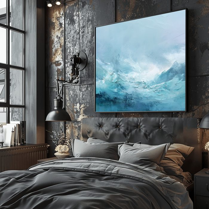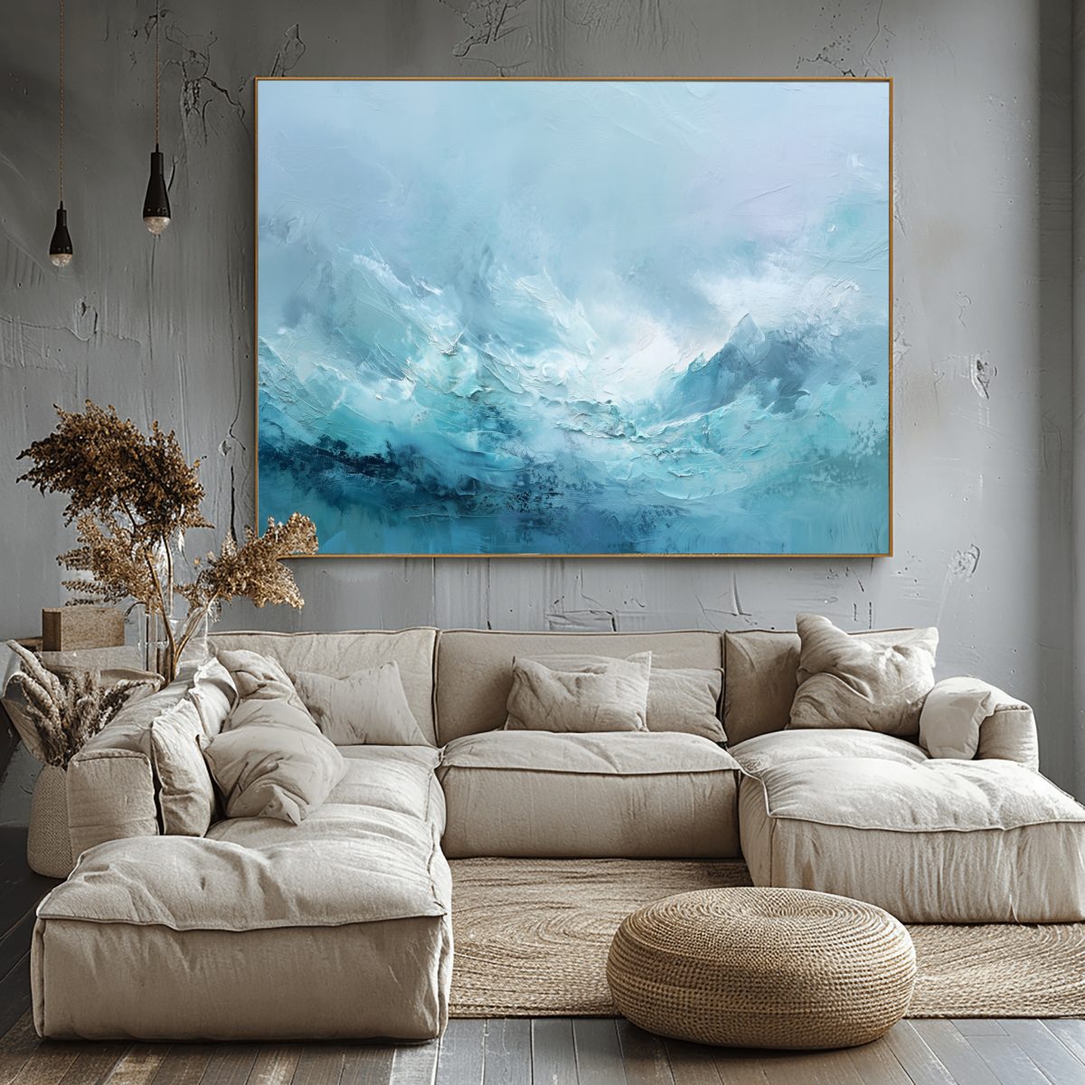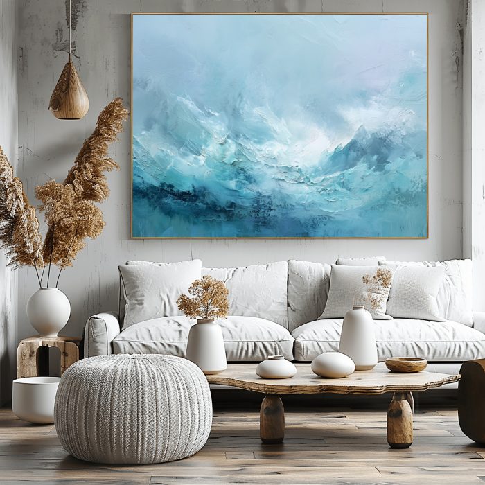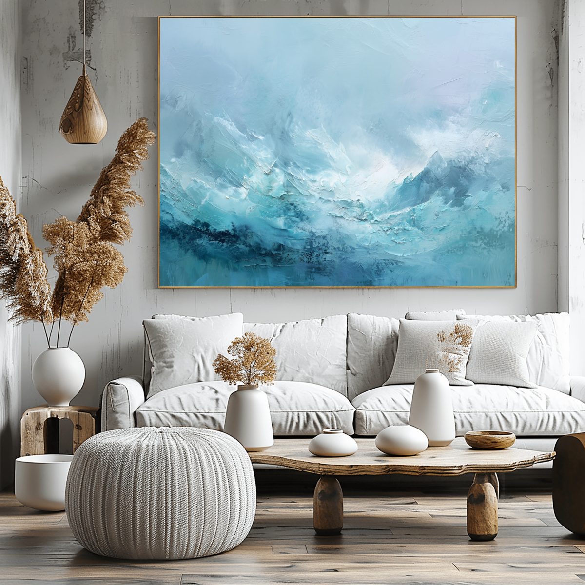 Ocean Surge is an amazing piece of wall art that feels like looking straight into a wave crashing or a deep ocean valley. It uses a lot of texture, which makes the blues and whites look like thick, churning water. The colors range from deep, dark indigo in the center to bright, clear aqua and soft white at the top, giving it a cool, refreshing, and dramatic feel. It’s powerful, but the soft, light blue at the edges keeps it from feeling too intense.