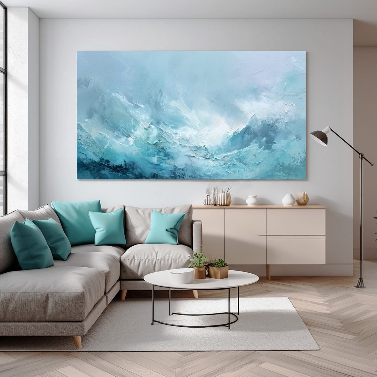 This is Ocean Surge, a huge Abstract Canvas Wall Art that brings the powerful movement of the ocean right into your living room. It features lots of texture and bright shades of blue and white.